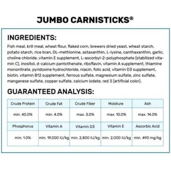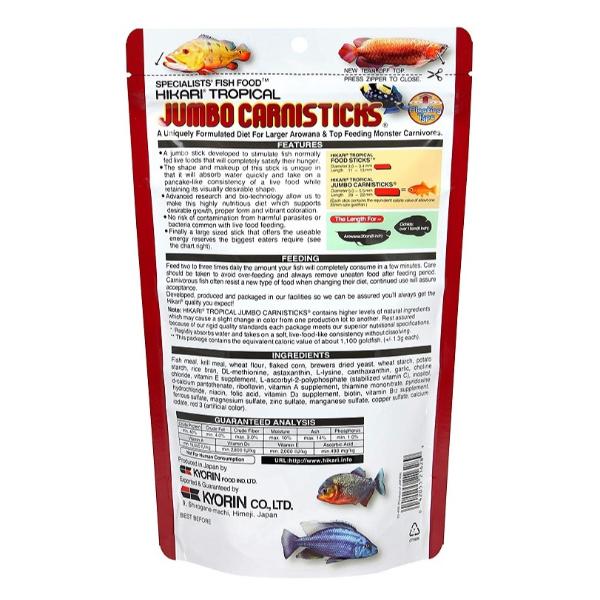 • Hikari Jumbo Carnisticks are specially formulated for large meat-eating aquarium fish such as Oscars, Arowana, Peacock Bass, and other predatory species.