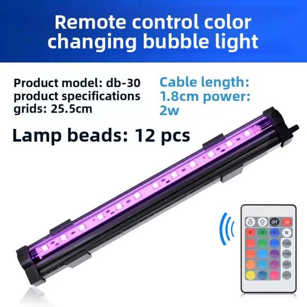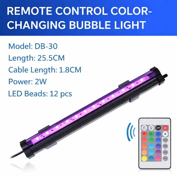 Enhance your aquarium with the Bubble Light DB-30 with Remote. This color-changing LED bubble light creates a stunning underwater effect using bright LED beads inside a clear bubble tube. The included remote allows easy control of colors and lighting modes, making it ideal for decorative aquarium lighting.